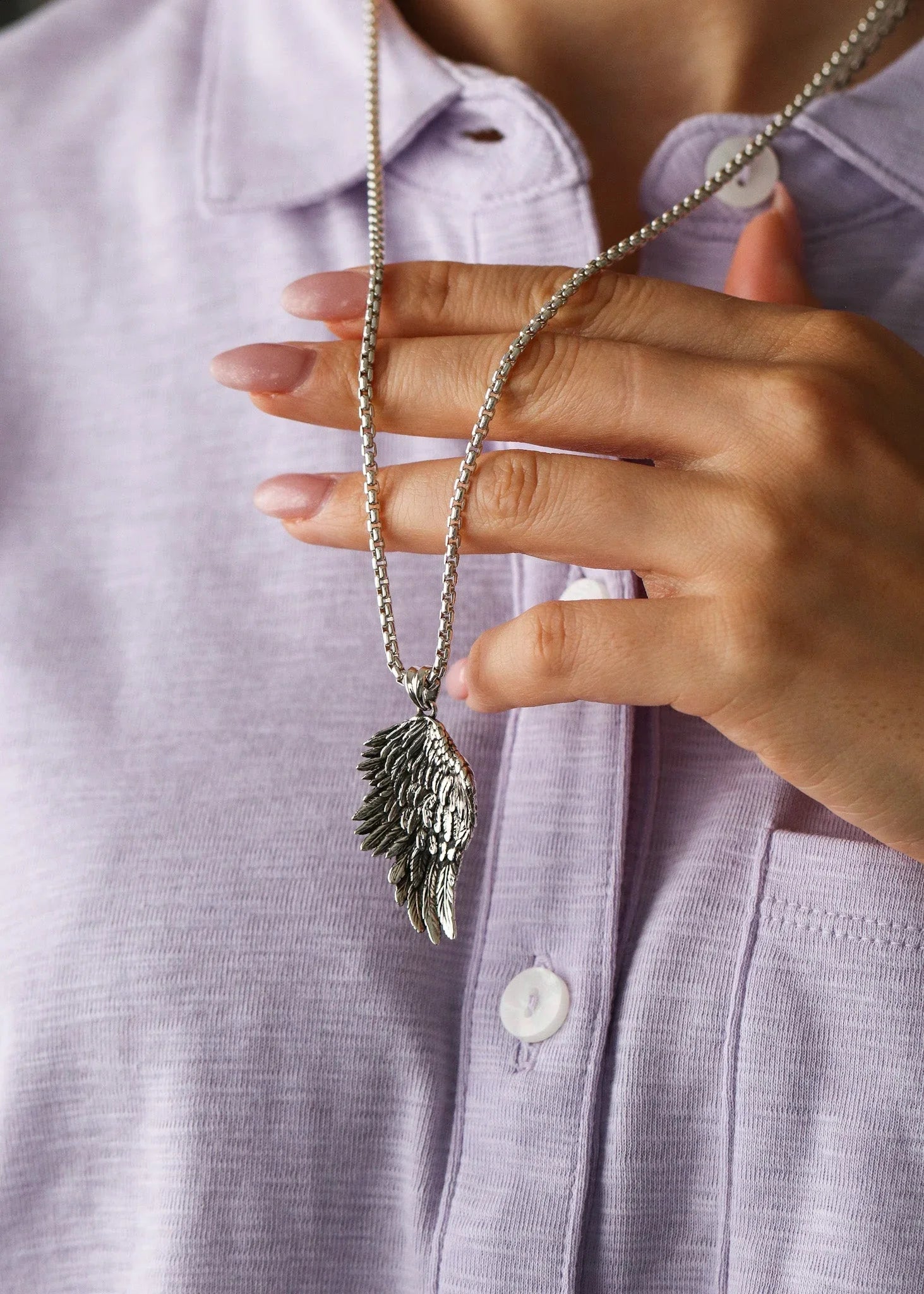 This gorgeous Silver Angel Wing Pendant is perfect for those who want to add a unique and meaningful touch to their everyday look. Crafted from sterling silver with delicate detail, it's a beautiful way to show your faith, fashion sense, and love for all things angelic. A perfect gift for any occasion!