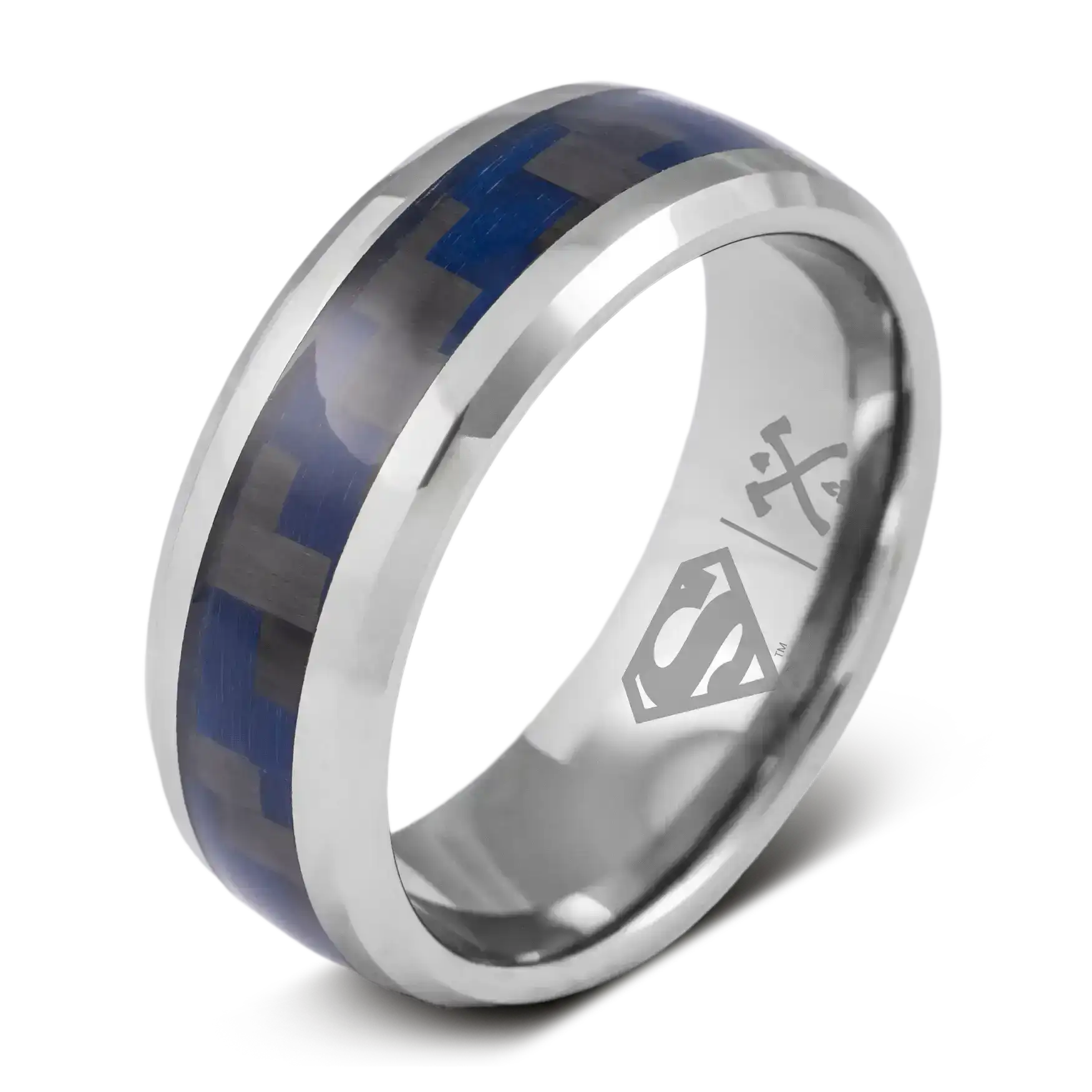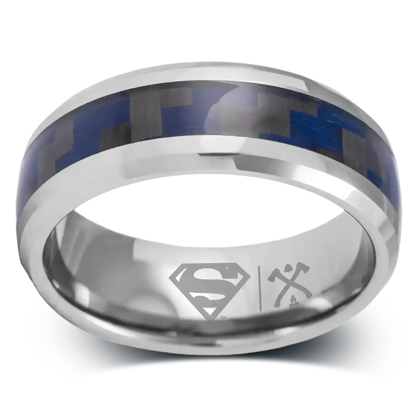 Tungsten with Blue and Black Carbon Fiber Inlay and Superman Logo Engraving