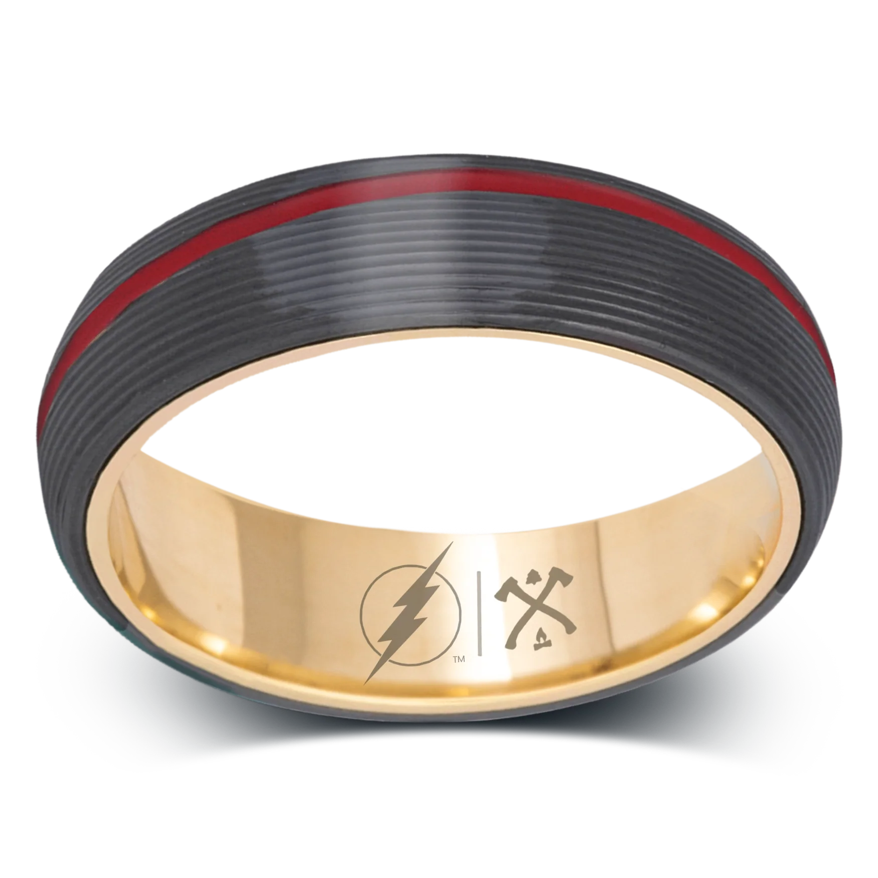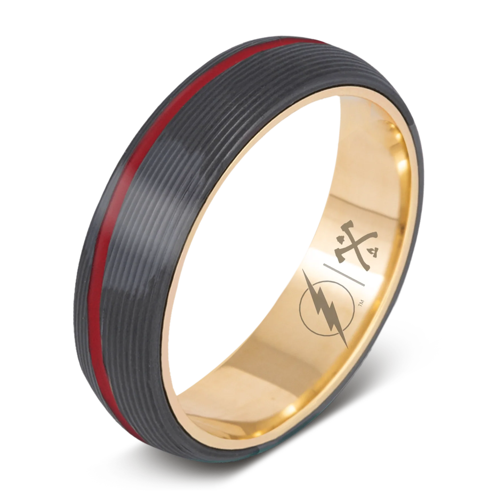 Black Zirconium (charcoal gray color) with 1mm Asymmetrical Red Cerakote Inlay, Solid 14K Yellow Gold Sleeve and Flash Logo Engraving