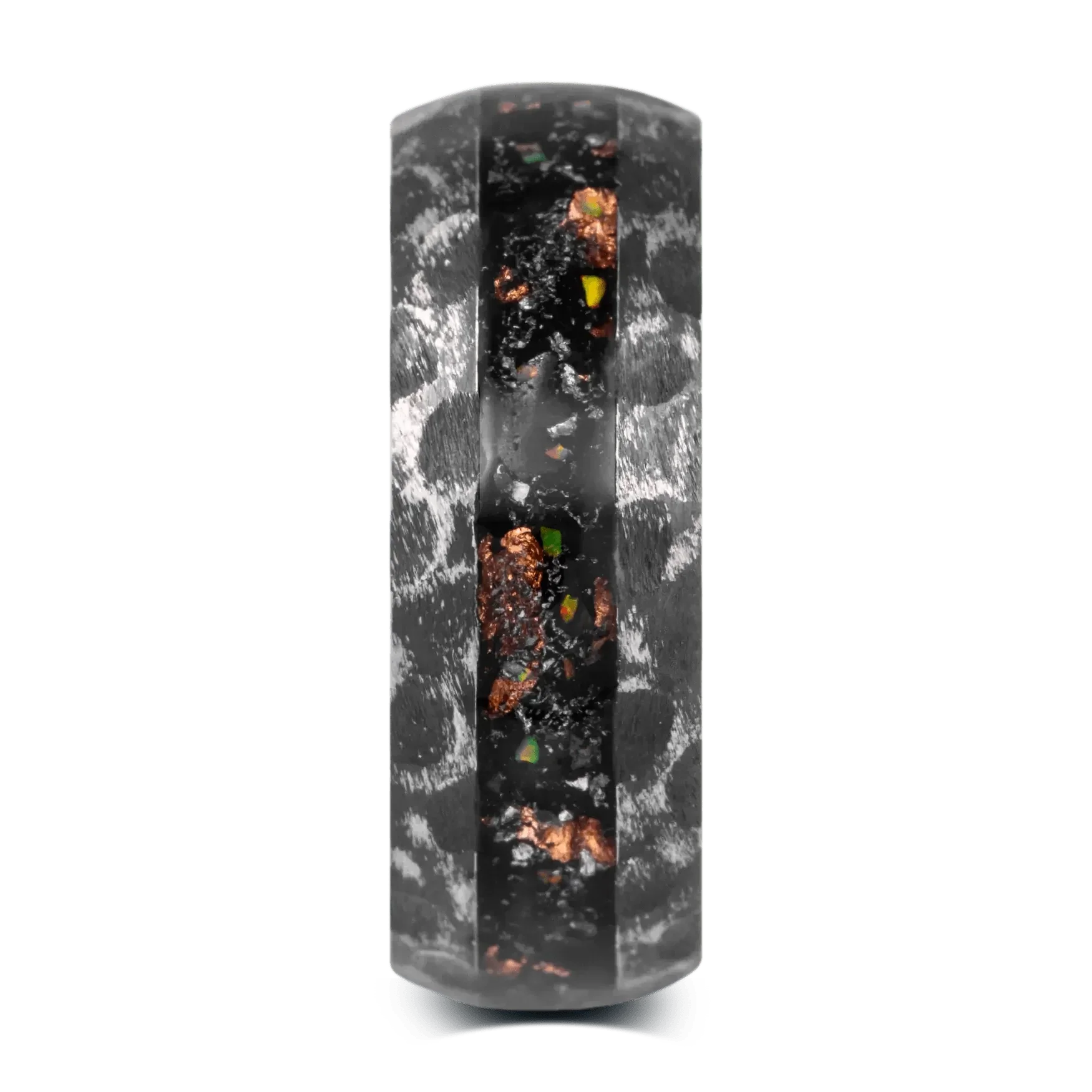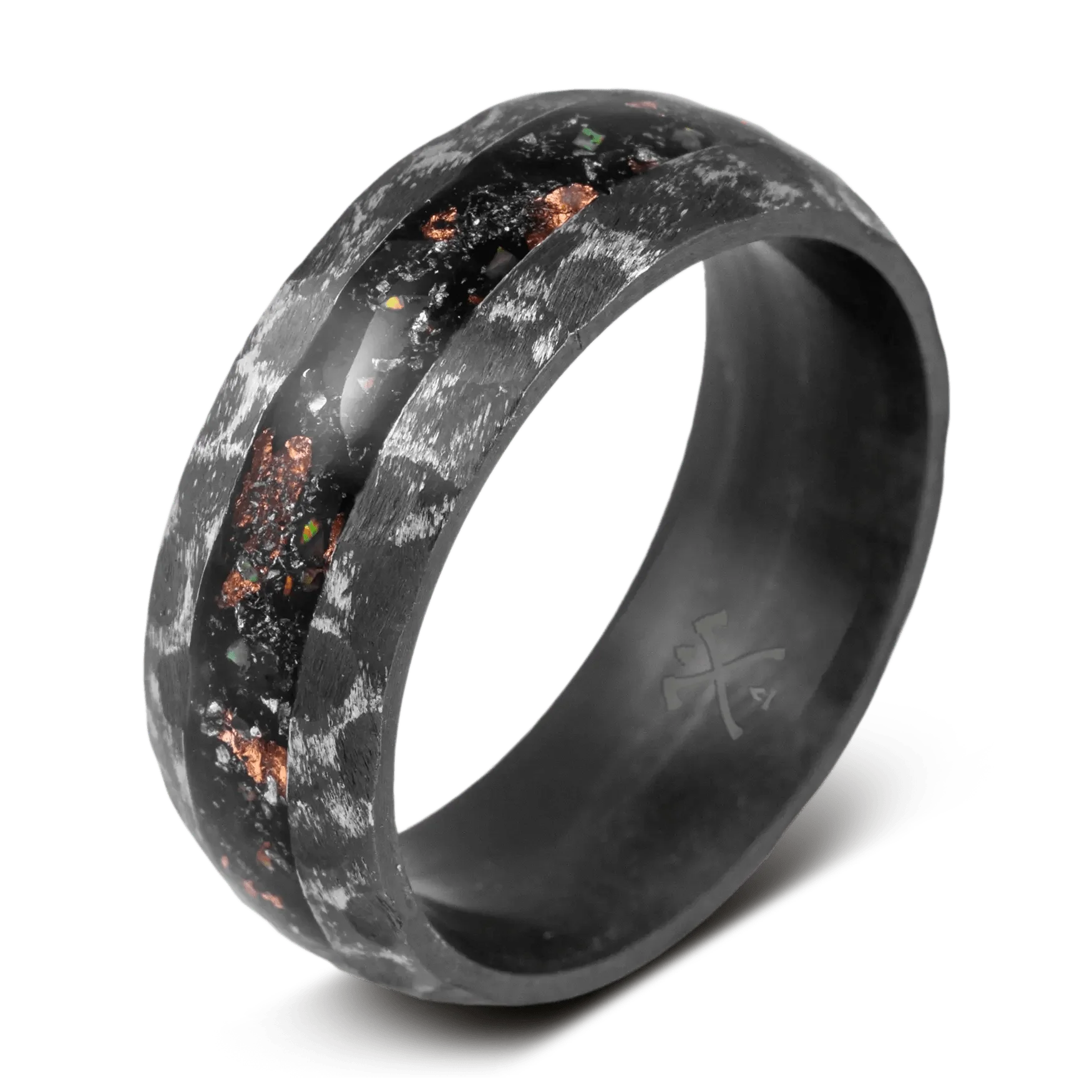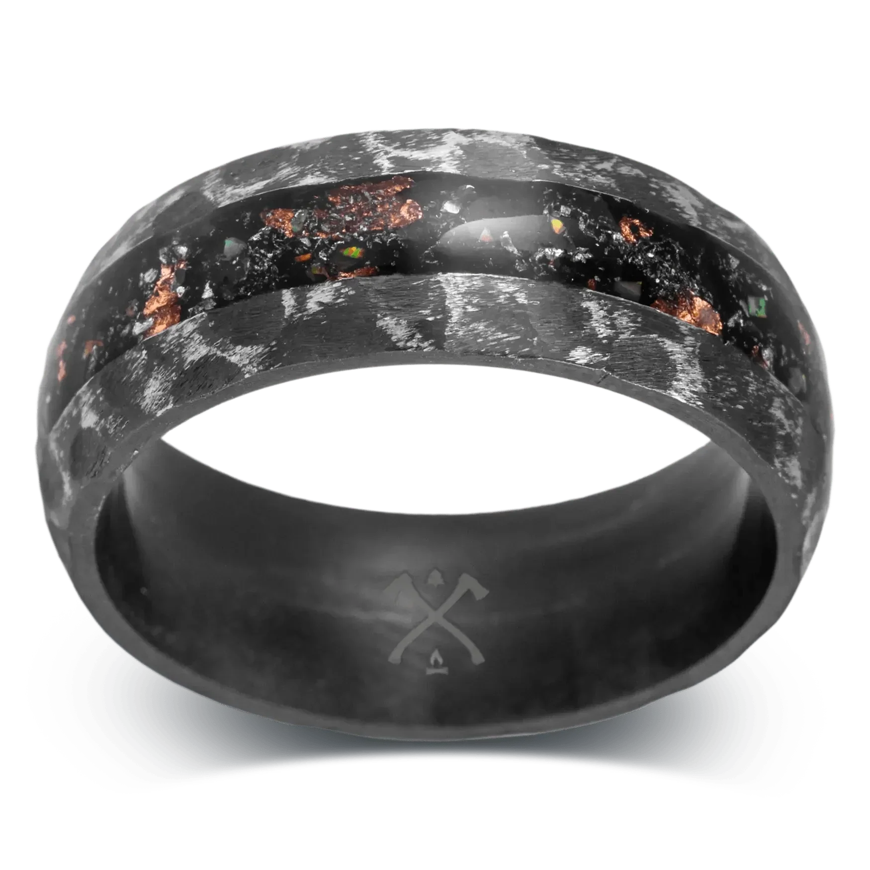 • Black Zirconium (charcoal gray color) with Authentic Ancient Viking Pouch Knife Shreds Inlayed with Copper Leaf, Obsidian, and Moon Dust Opal